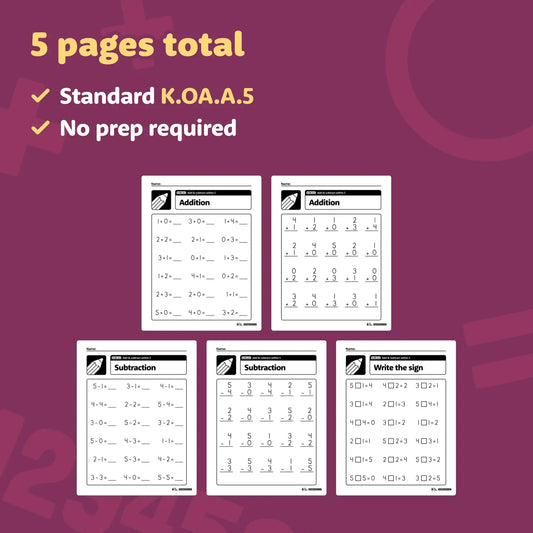 Add and Subtract Within 5 Worksheets | K.OA.A.5