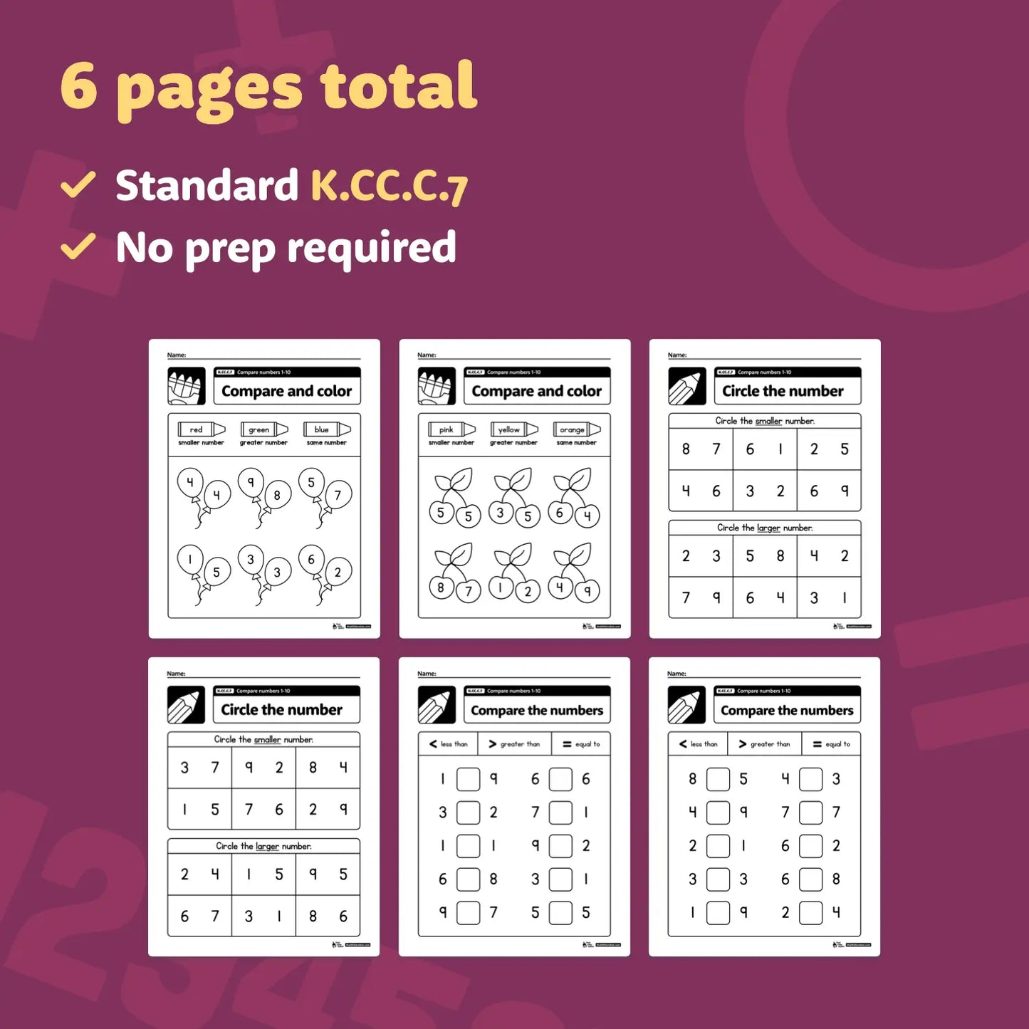 Turn that tricky comparing numbers to 10 standard into a set of easy, bite-size activities! These differentiated K.CC.C.7 worksheets are the simplest way to practice kindergarten Common Core math — perfect for any lesson or center involving counting or comparing numbers as greater than, less than, and equal to.