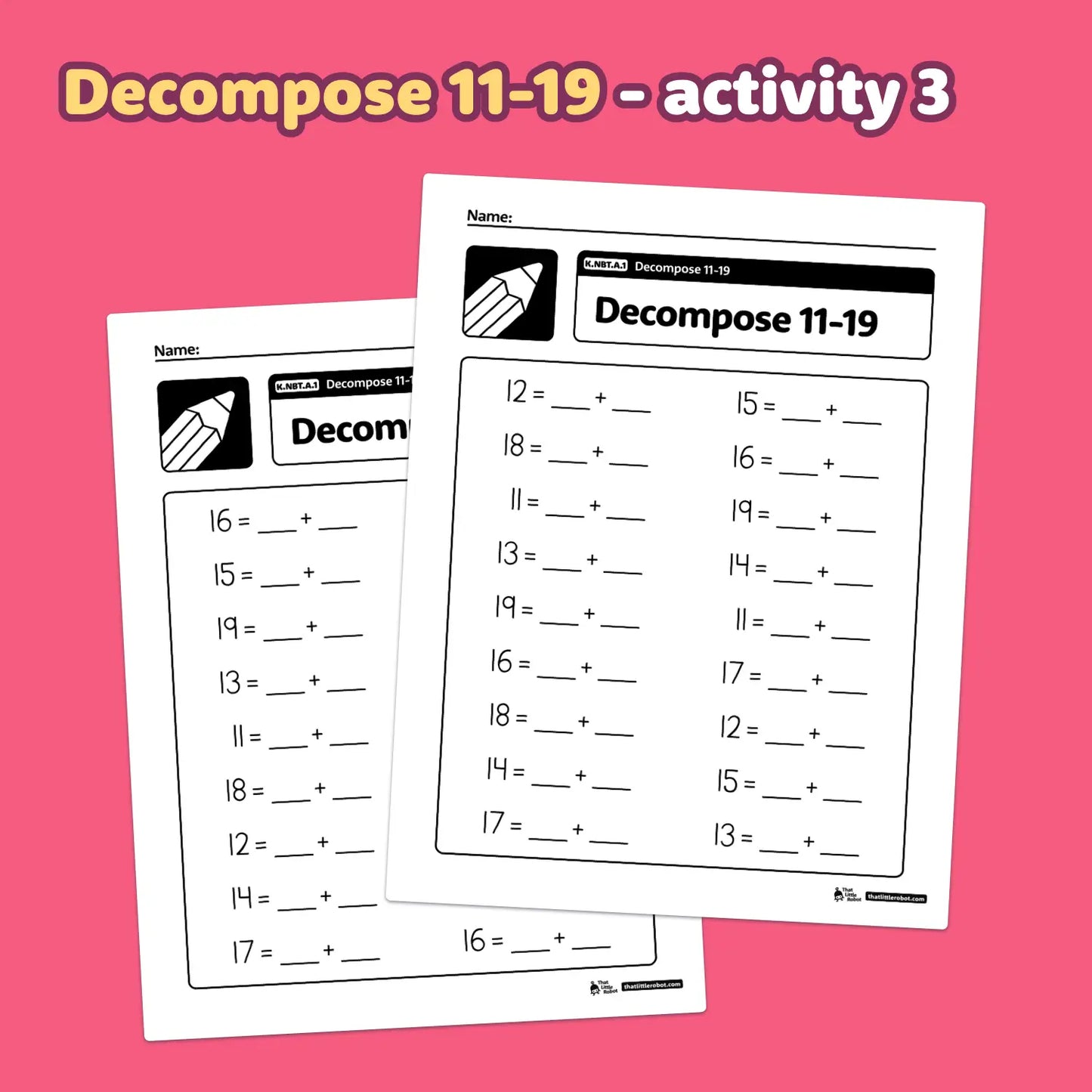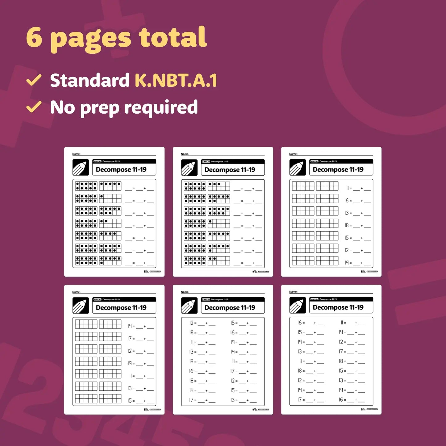 Decompose Numbers 11-19 Worksheets | K.NBT.A.1