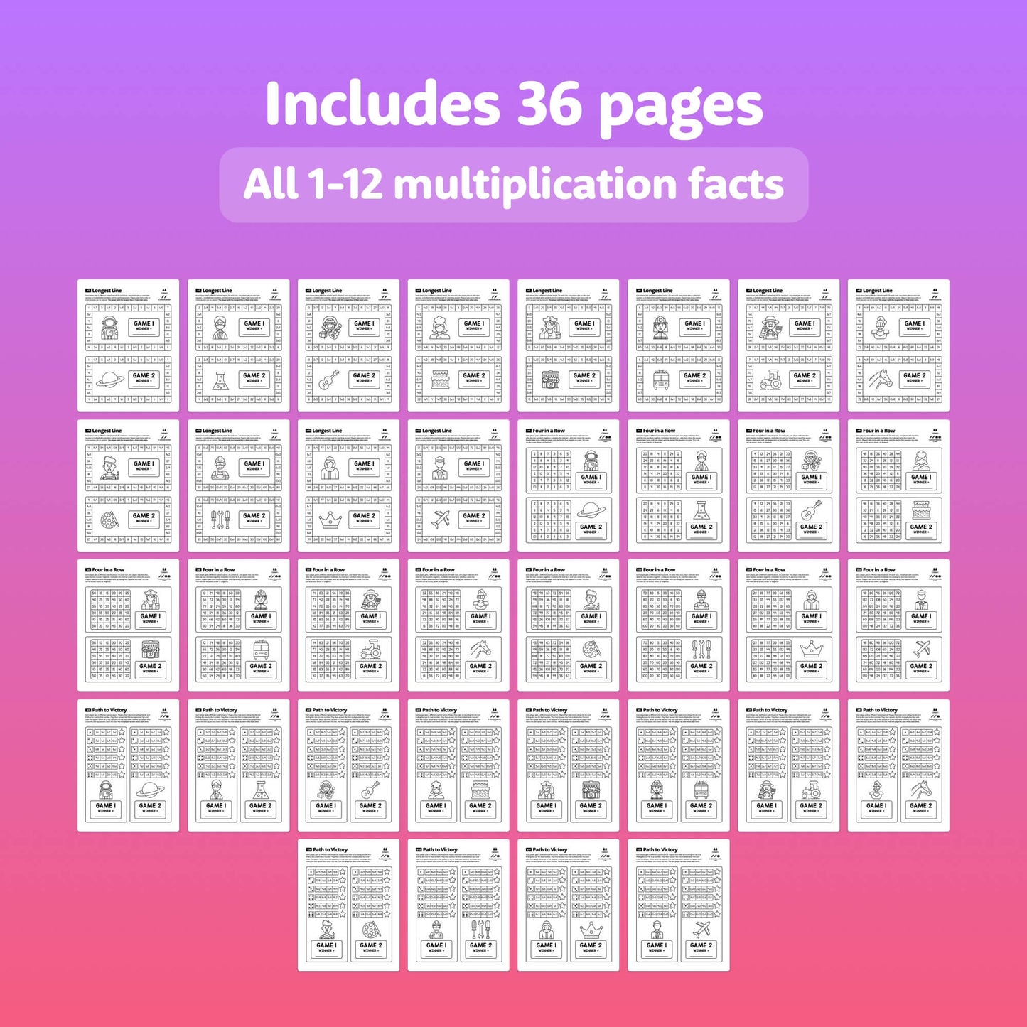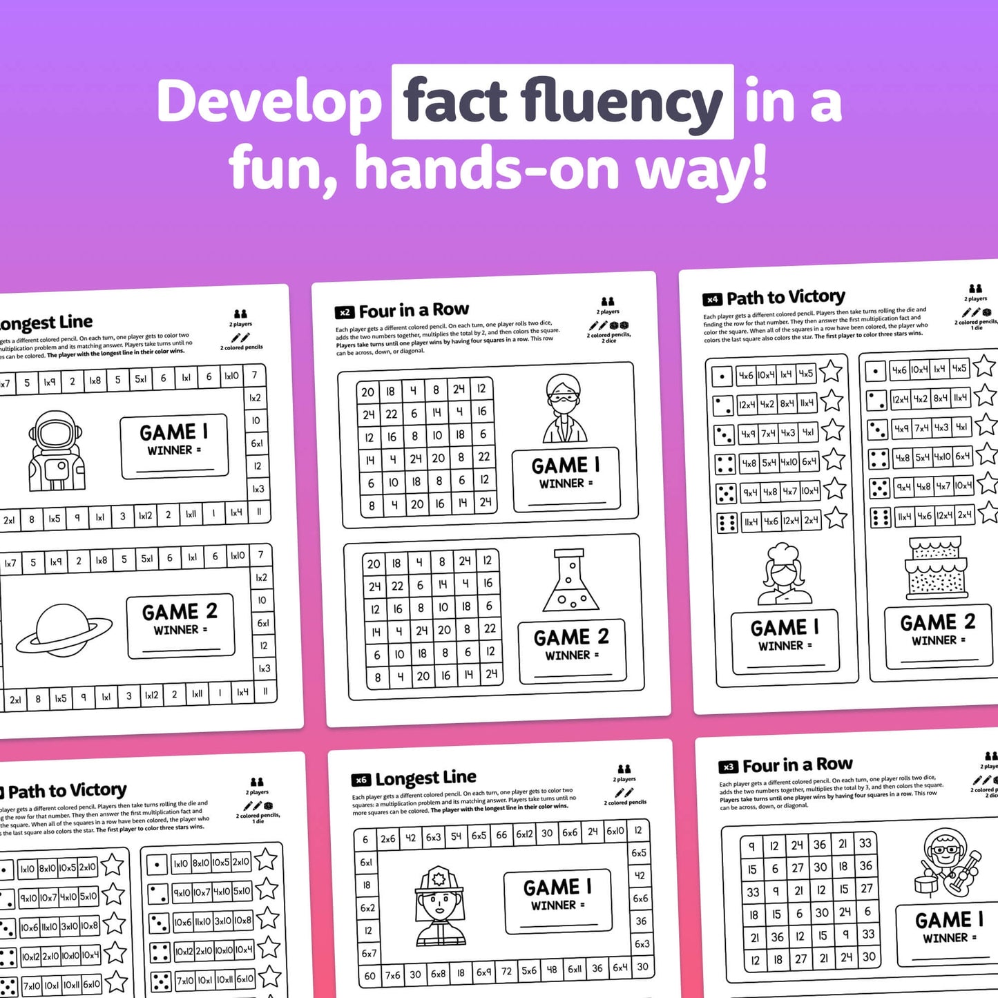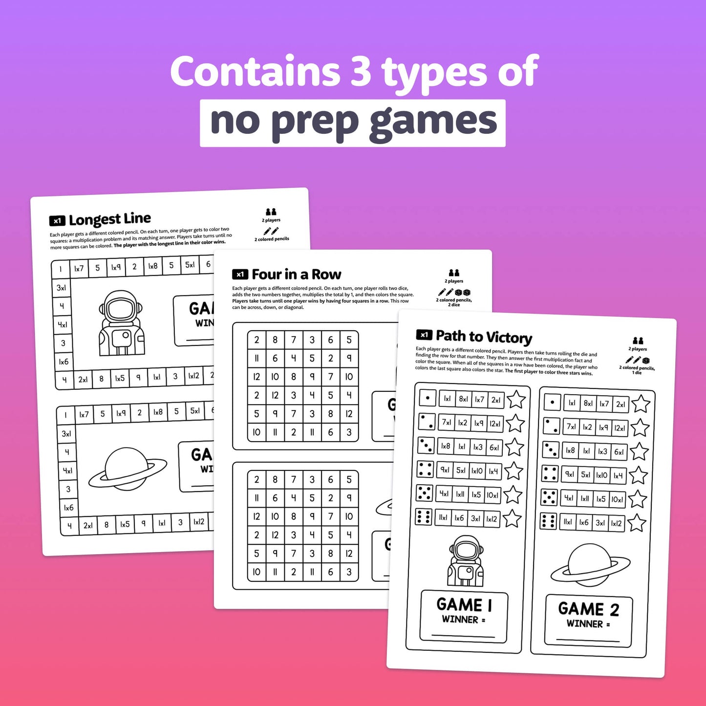These no prep games are easy to learn and ultra-engaging; a fantastic way to practice multiplication fact fluency! Three different types of games are included, with versions covering all 1-12 multiplication facts.