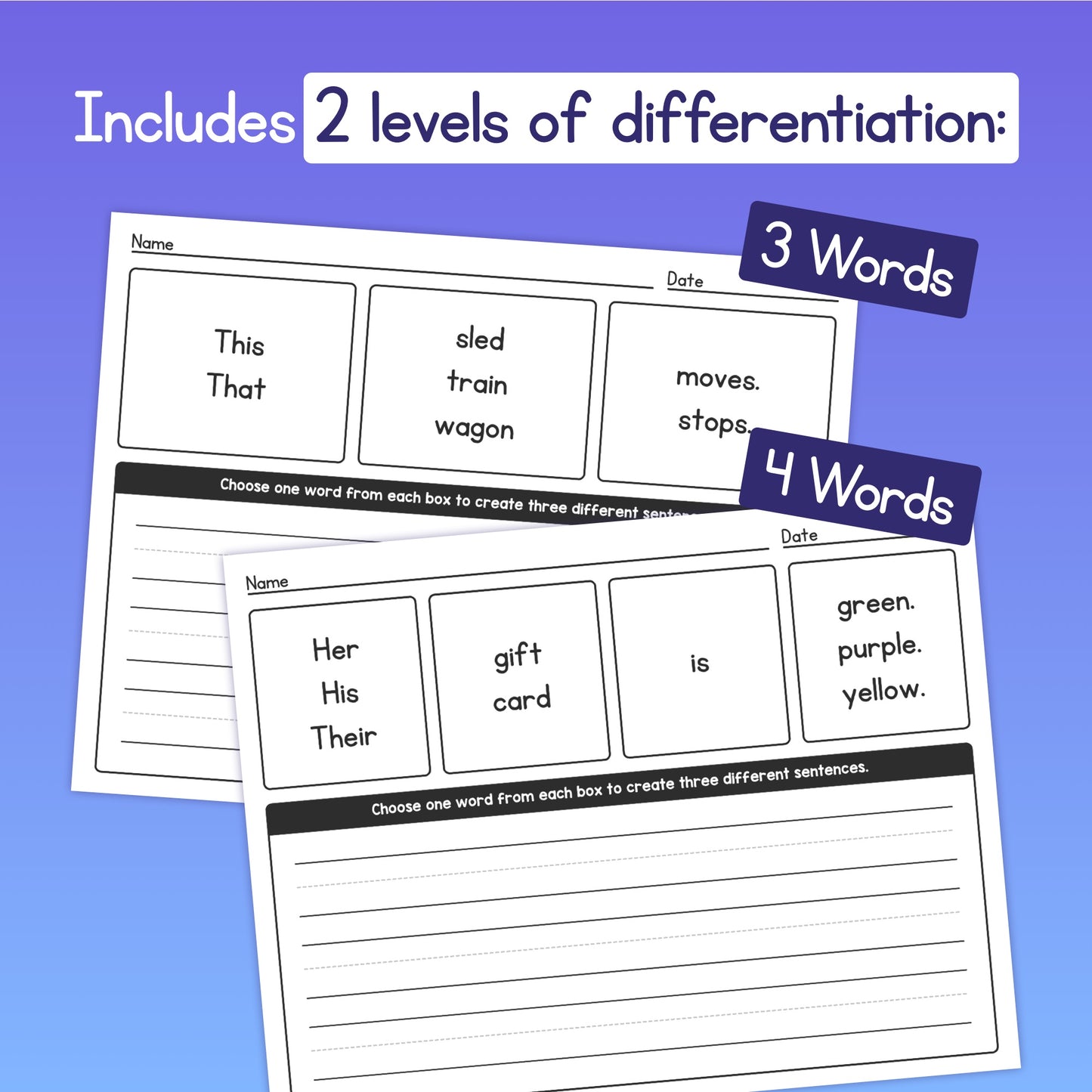 Create a winter wonderland of words! By choosing from a word bank to create cozy, winter-themed sentences, beginners can explore the world of writing in a stress-free way.